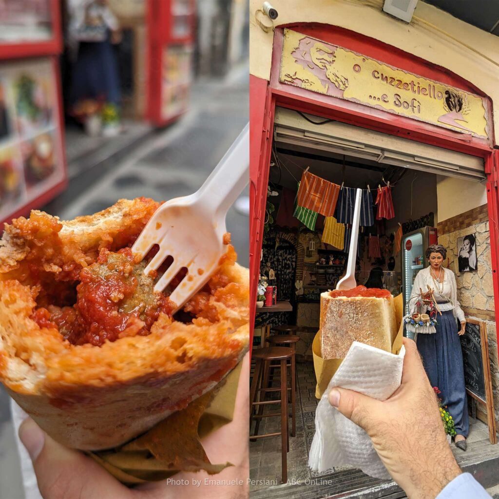 Per un pranzo DAVVERO CONSIGLIATO potete anche valutare “O’ cuzzetiello e Sofí” dove si prepara un ottimo prodotto: Il nome “cuzzetiello” deriva dal napoletano “cuzzetto”, che significa “coccige”, in riferimento alla forma del panino che ricorda quella della parte terminale del pane cafone. Il cuzzetiello si prepara con una delle due estremità del pane cafone, che viene privata della mollica interna, creando una sorta di “conchiglia” croccante. La parte interna viene poi riempita con un ragù ricco e saporito, solitamente a base di carne di manzo, maiale o polpettine. Il costo è tra gli 8 e i 12 euro, in base al ripieno.