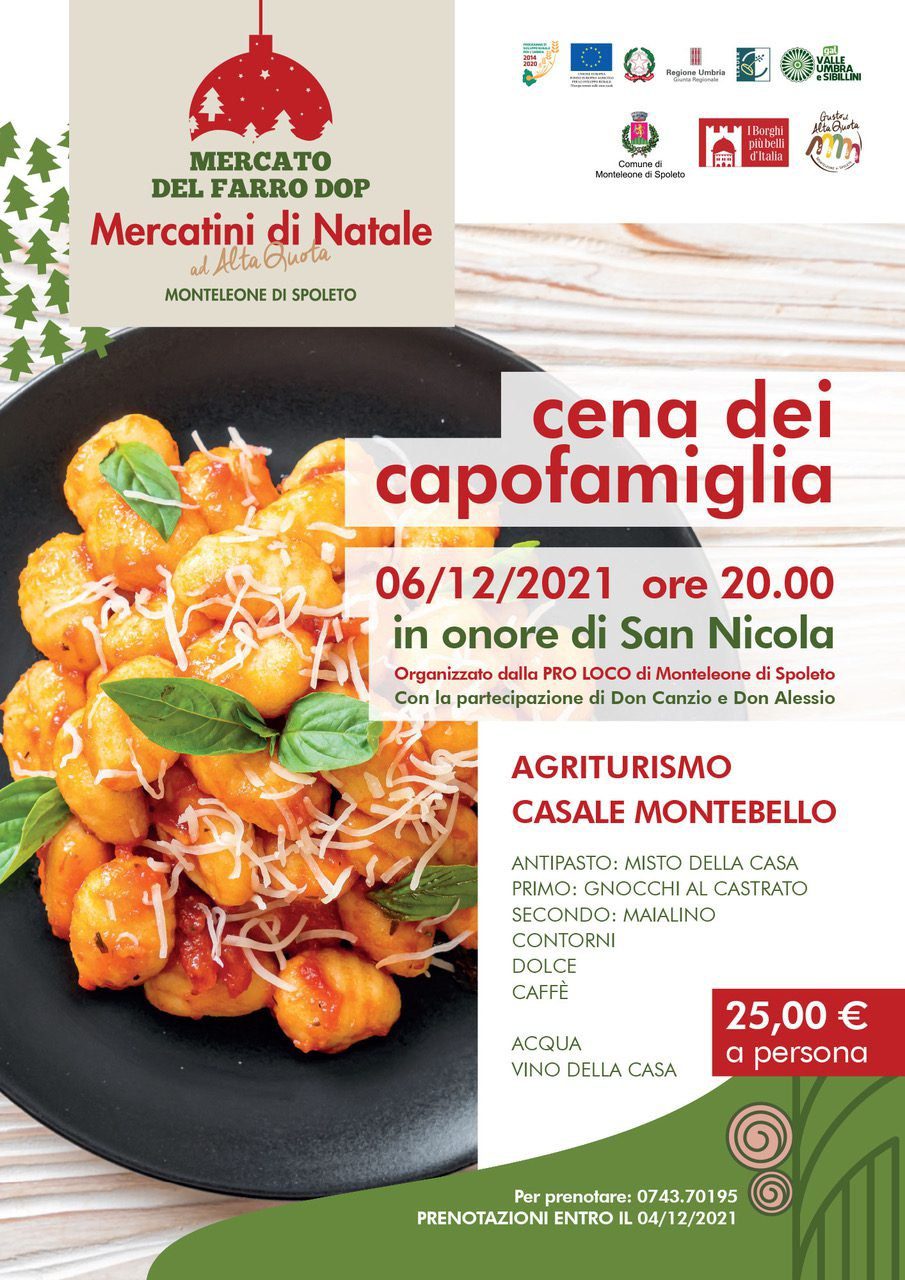 Lunedì 6 dicembre si festeggia San Nicola, Santo Patrono. Per i più piccoli e per tutte le famiglie dalle ore 16,00 un pomeriggio in compagnia di Babbo Natale con tante iniziative di animazione itinerante per le vie del borgo. E alle ore 20,00 torna in scena la tradizione con la Cena dei Capifamiglia (organizzazione a cura della Pro Loco di Monteleone di Spoleto).